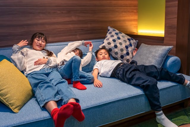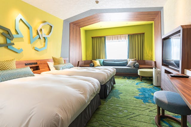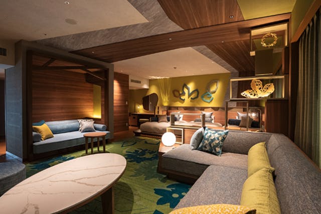 スーペリアファミリールーム「Hoshi-akari」も見学させてもらいましたが、最上階からサーキットを見渡せる窓に、広々としたベッドとソファがあり、子どもたちと一緒にリラックスできそうな素敵なお部屋でした!