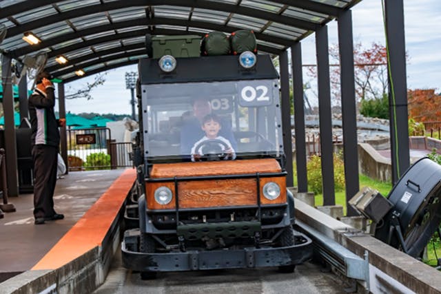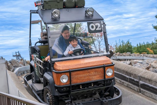 SUMIKAで癒やされた後は、エキサイティングな「オフロードアドベンチャー DEKOBOKO」へ。2歳から乗れて、小学3年生以上は一人でも運転できます。(※2歳~小学2年生以下のお子様は、お子様1名につき、中学生以上の方1名の同伴が必要。)