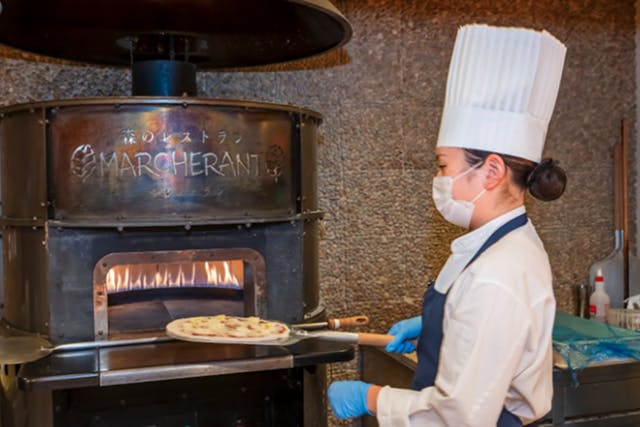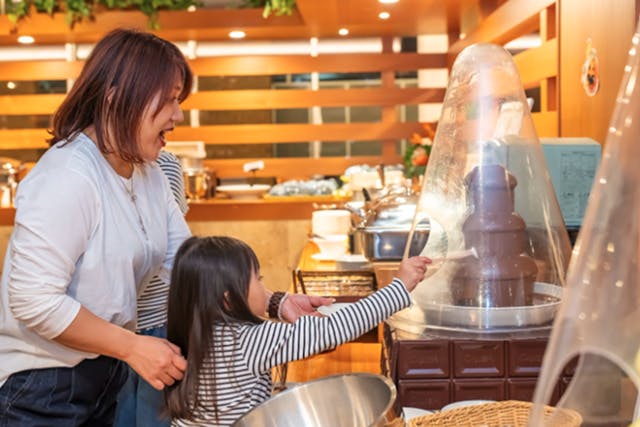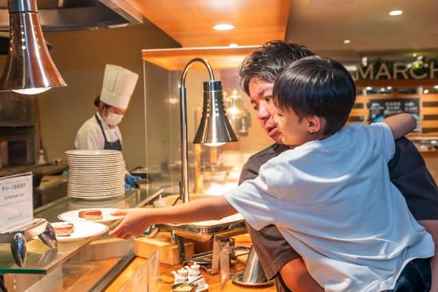 お楽しみの夕食は、ホテル内ビュッフェレストランで。口コミで「親のテンションが上がる」と評判のビュッフェです。入ってすぐのところにあるライブキッチンには、立派なピザ窯や鉄板があり、想像以上に本格的!