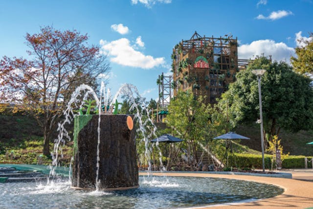 上の子ふたりとお父さんが向かったのが、水の遊び場の奥、階段を登った先にそびえる「森感覚アスレチック DOKIDOKI」。巨大などんぐりの木のてっぺんを目指す、木登り感覚のアスレチックです。高さを活かした遊具がありスリル満点。