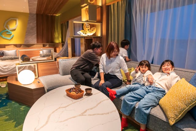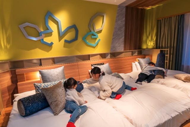パークで閉園時間まで遊び、今日のお宿「モビリティリゾートもてぎホテル」へチェックイン。案内されたデラックスファミリールーム「YADORIGI」は2025年3月にできたばかり。
