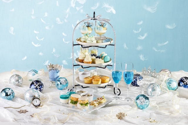 川越プリンスホテルで開催される「プリンセス アフタヌーン ティー セット」は、まるでおとぎ話の世界に迷い込んだかのような体験が待っています。美しいティースタンドには、ティアラを飾ったスイーツや、ドレスのフリルをイメージした水色のパフェが並びます。特に、青りんごムースを使った「プリンセストゥ」や、スワンモンブランは見た目にも華やかで、思わず写真を撮りたくなる美しさです。セイボリーも含まれ、全てがプリンセスをテーマにした幻想的なひとときを演出。家族や友達と特別な時間を過ごしたい方にピッタリです。