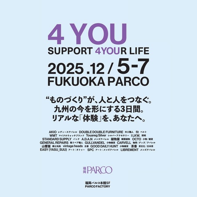 福岡PARCOで開催される「4 YOU」は、九州にゆかりのあるアーティストや20以上のブランドが集結するマーケットイベントです。「あなたのための、あなただけのもの」をテーマに、アクセサリーや雑貨、アパレルなど、作り手の想いがこもったリアルな“ものづくり”に出会えます。大量生産品にはない魅力に触れられる絶好の機会。自分へのご褒美や、大切な人へのクリスマスプレゼントを探しに、天神でのショッピングを楽しんでみてはいかがでしょうか。