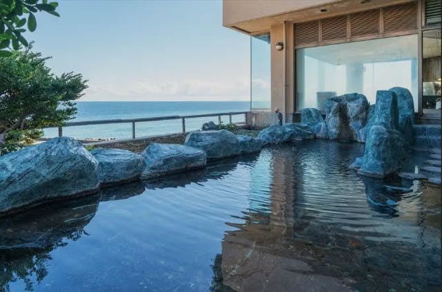 「熱川館」の自家源泉である八幡の湯は、無色透明で優しい肌ざわりが特徴。屋根のない開放感のある露天風呂から眺める景色は、日常を忘れさせてくれるでしょう。内風呂でも大きな窓から雄大な海を眺めることができ、広々とした湯船で贅沢なひとときを満喫できます。都会の喧騒を忘れ、心身をリフレッシュするのにぴったりのロケーションです。