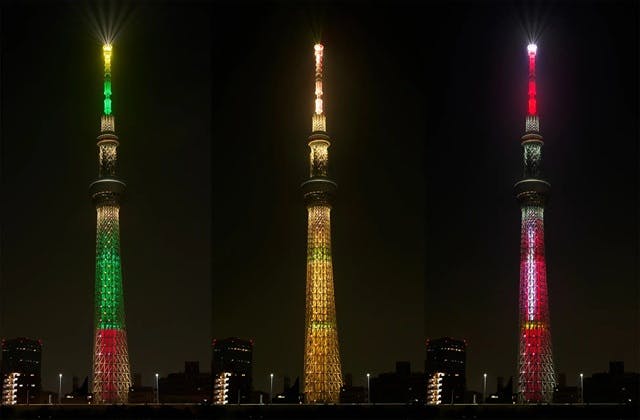| 時間 | 3種類の色が約1分ごとに変化するスカイツリーの特別ライティング:17:30~22:00 ※12月24日(水)と25日(木)は17:30~24:00で点灯 |