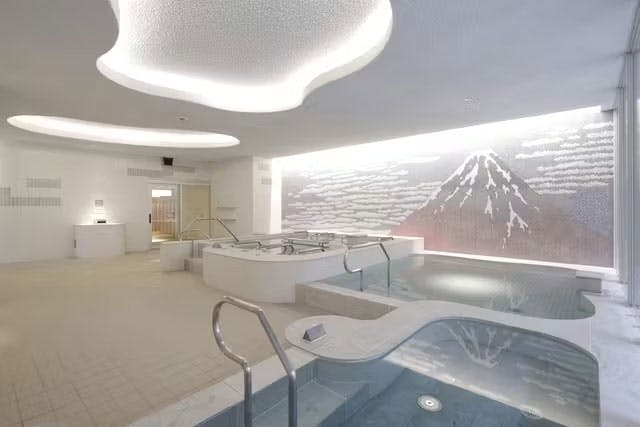 「両国湯屋江戸遊」は、和モダンなデザインが特徴的な都市型スパ。館内には、浮世絵風の美しい大浴場をはじめ、スーパージェット湯や漢方湯、寝湯、高濃度炭酸泉、水風呂など6種類のお風呂が揃います。さらに、熱伝導性の高い本格フィンランドサウナやアロマスチームサウナも完備。休憩スペースや食事処も整っているので、気軽な日帰り利用から夜通しのリラックス滞在まで、幅広く利用できますよ。