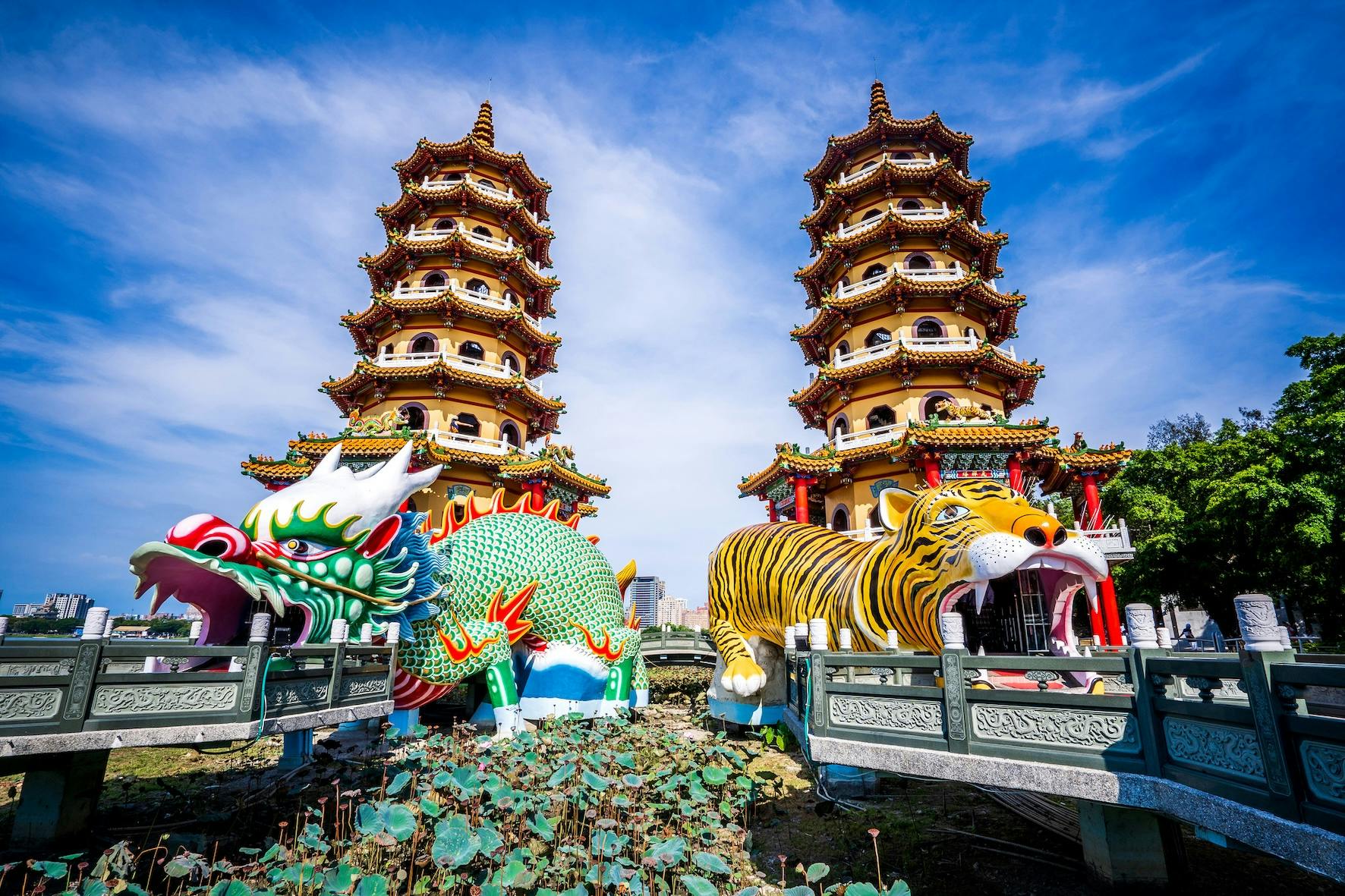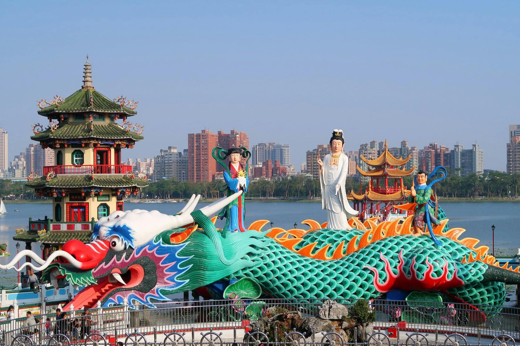 開運スポット。高雄のシンボル的存在で、蓮池潭の南西のほとりに立つ一対の七重の塔です。魔物を近づけないという橋の先に塔があります。龍の口から入って虎の口から出ると、これまでの悪事が清められ、ご利益があると信じられています。塔の内部には龍の口に死後の世界、虎の口に仏教説話のレリーフが描かれています。特に蓮の花が咲く、初夏がベストシーズンです。
