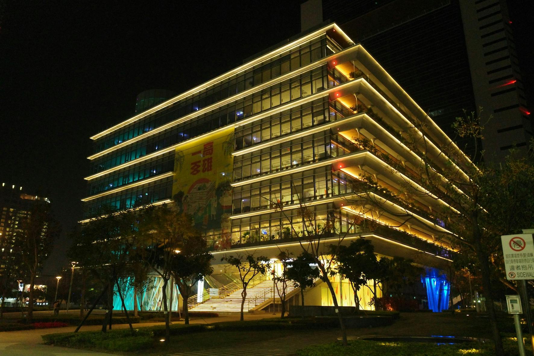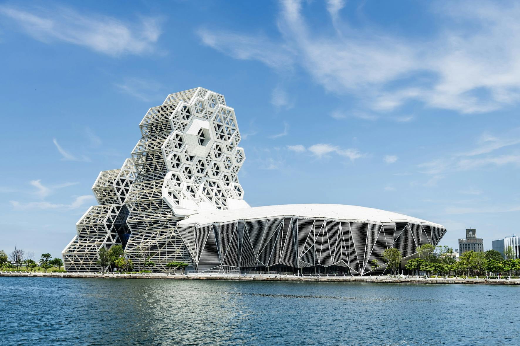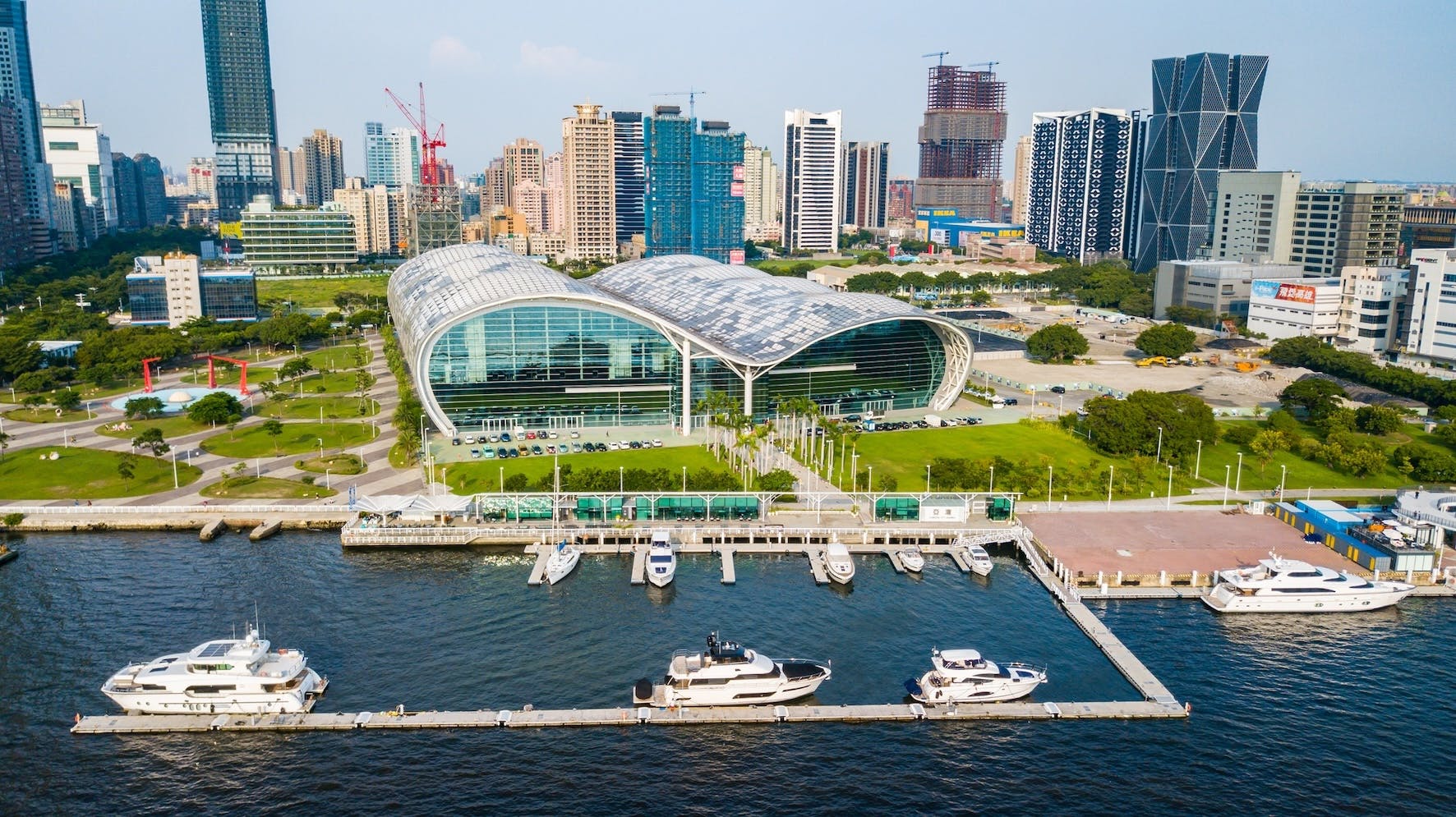 熱線反射ガラスで覆われた斬新なデザインの国際コンベンションセンター。LRT高雄展覽館駅より徒歩約5分。
