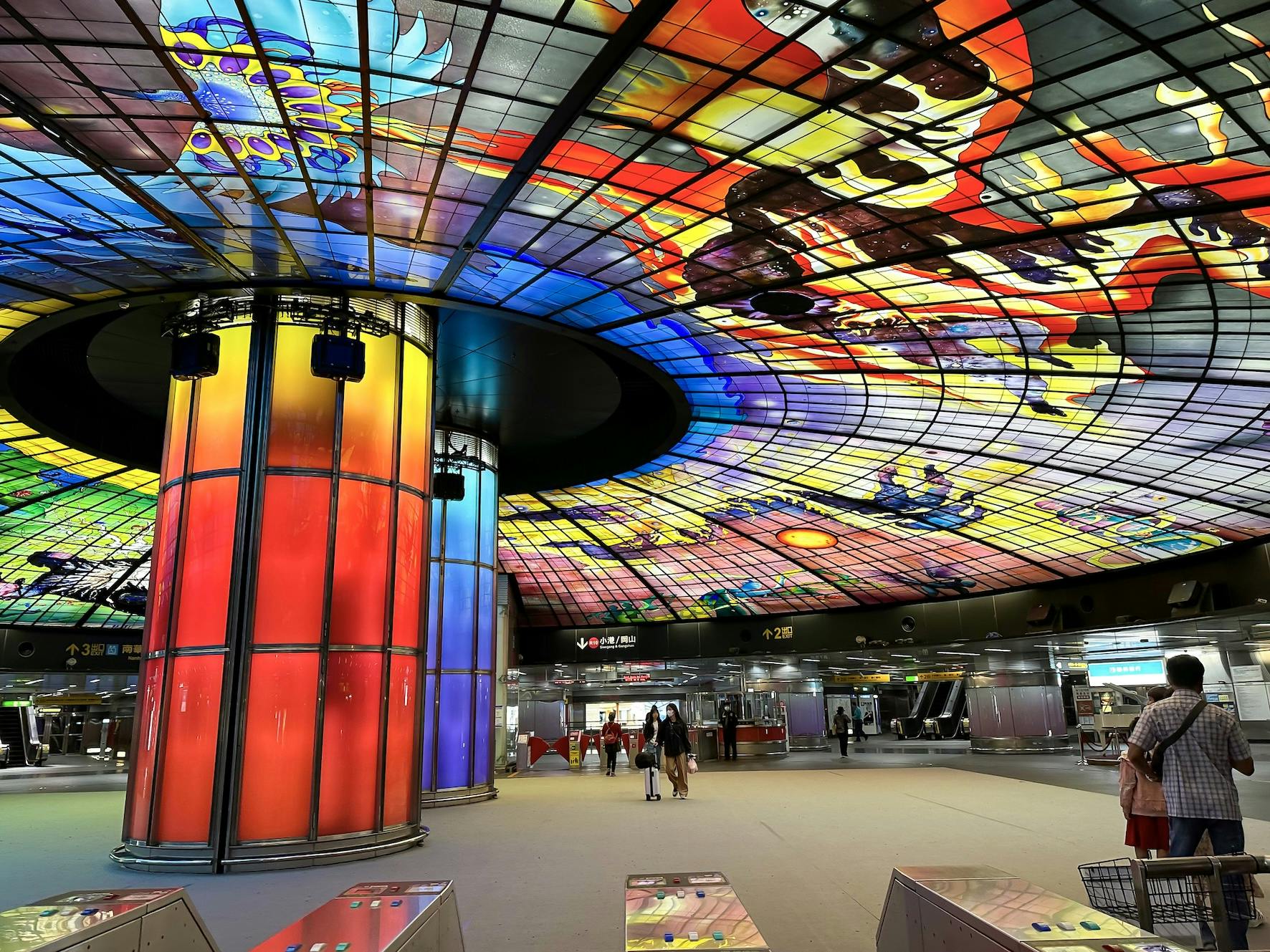 アメリカの旅行サイトで「世界で最も美しい地下鉄の駅」の第2位に選ばれたことで知られる駅構内の巨大ステンドグラスアートです。イタリアの芸術家が4年もの歳月をかけて制作された作品。直径約30m、4,500枚のステンドグラスが使用されており、「水・生命の子宮」「地球・繁栄と成長」「光・創造の精神」「火・破壊と再生」の4つのテーマで人間の一生を描いています。
