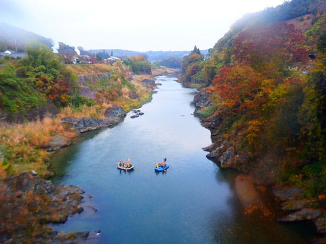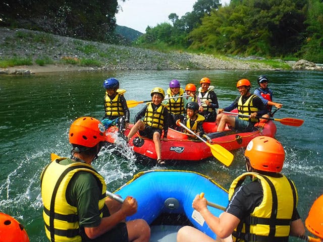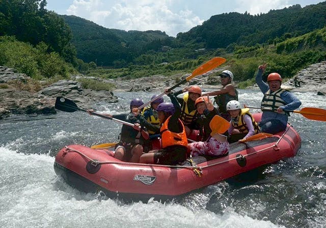 8人乗りのボートで、みんなで一緒に川下りを楽しむラフティング体験!急流と穏やかな流れのポイント、どちらも楽しめるコースになっていてそれぞれに異なる楽しさが!