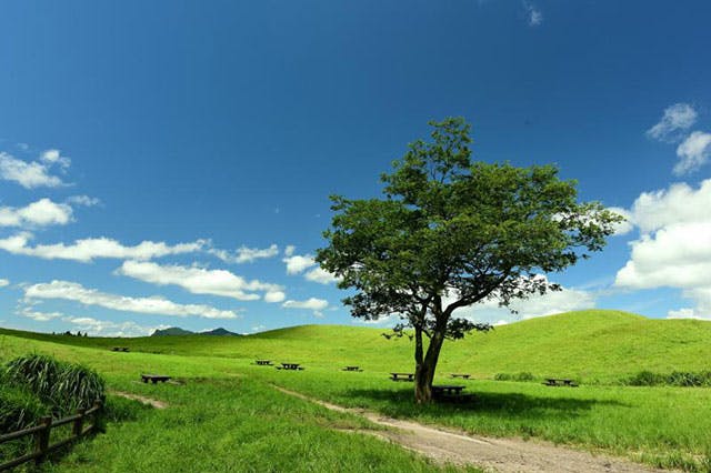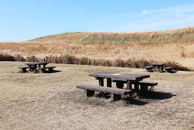 高原の中には、自由に利用できるテーブルが並ぶ広場も。家で作ってきたマイ弁当を広げるも良し、用意されたお弁当をみんなで頬張るも良し。広大な大自然の中で食べる食事はおいしさもグーンとアップします。