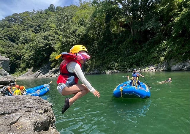 川下り以外の楽しさも大きな魅力!ツアーの途中ではボートを止めて川遊び。川岸の3m近い高さから飛び込んだり、ライフジャケットひとつでプカプカ川に流されたり…。自然との一体感をたっぷり満喫できます!