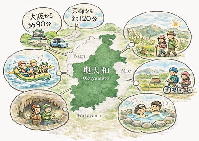 大型テーマパークこそありませんが、そのぶん時間の流れはゆったり。家族で自然と向き合いながら過ごす、肩ひじ張らない旅にぴったりのエリアです。京都や大阪から車で約1.5〜2時間とアクセスも良く、日帰りでも訪れやすい“ちょうどいい距離感”。気負わず出かけられるのも、奥大和がファミリーに選ばれる理由のひとつといえます。
