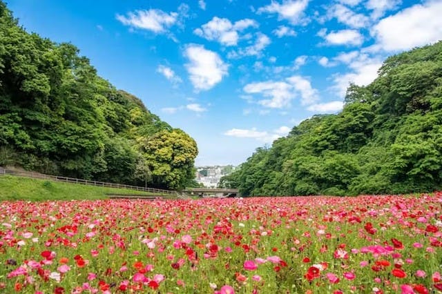 くりはま花の国は、四季折々の花景色と遊び場が一体になった、家族で一日楽しめる大型公園です。春には一面に広がるポピー、秋には丘を彩るコスモスが見頃を迎え、訪れる季節ごとに違った表情を楽しめます。園内の「冒険ランド」には、迫力あるゴジラのすべり台や長いローラーすべり台があり、体を思いきり動かして遊びたい子どもにもぴったり。広い敷地内の移動には汽車型のフラワートレインを利用でき、小さなお子さま連れでも無理なく園内を巡れます。ハーブ園や足湯など、親子でゆったり過ごせるエリアも整っており、遊びと癒やしの両方を楽しめるのも魅力のひとつ。花を眺めながら散策したり、お弁当を広げてピクニックを楽しんだりと、その日の気分に合わせた過ごし方ができるスポットです。自然にふれながら、思い出に残る一日を過ごしたいファミリーにおすすめです。