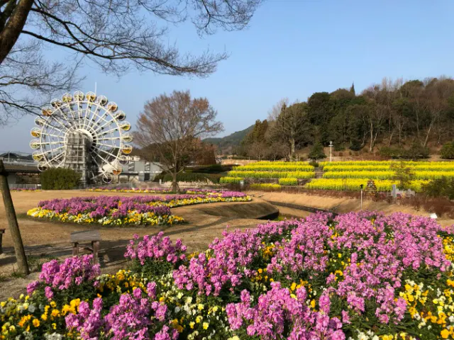 山口県柳井市に位置する「やまぐちフラワーランド」は、さまざまな花を楽しめるテーマパークです。園内には観覧車がシンボルとしてそびえ立ち、広大な花壇では菜の花とともにビオラやチューリップなど、色とりどりの花々が咲き誇ります。特に、黄色い菜の花と他の花の鮮やかなコントラストは、春の写真撮影にぴったり。季節ごとのイベントも開催されるため、訪れるたびに新しい発見があるでしょう。