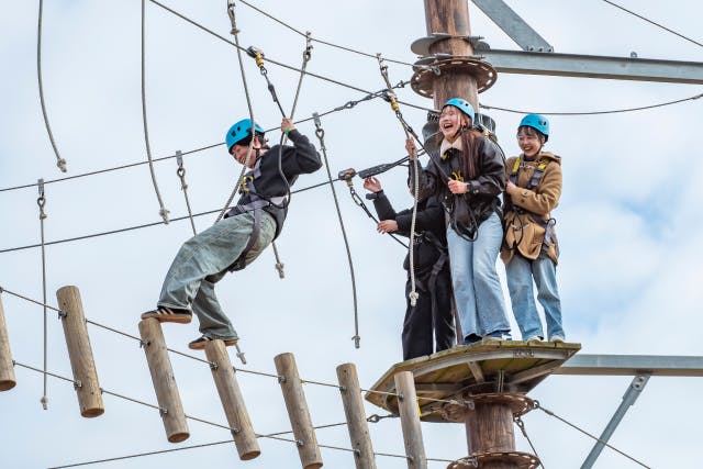 大人でも本気になる本格アスレチック。不安定な丸太やロープを攻略した先には、スリル満点のジャンプが待っています!