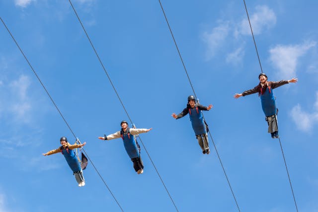 鳥のような視点で、最高時速75kmの滑空を体験!4人同時に並走できるので、友達と一緒に絶叫と爽快感を共有できます。