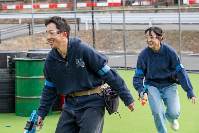 障害物に身を隠し、仲間と連携して敵陣へ攻め込むサバゲー体験!チーム戦で盛り上がること間違いなし。スポンジ弾なので痛くないのも安心ポイントです。