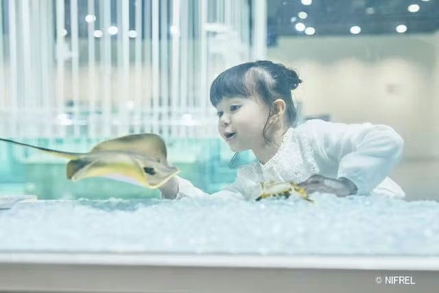 「NIFREL(ニフレル)」は、「感性にふれる」をコンセプトにした新感覚のミュージアム。水族館、動物園、美術館の要素が融合しており、生きものたちの個性的な展示やアート作品のような空間演出が特徴です。ホワイトタイガーやミニカバなど珍しい生きものを間近で観察でき、まるでアートを鑑賞するような感覚で生命の多様性や美しさを感じられます。館内には、生きものを眺めながら飲食ができるカフェやミュージアムショップも併設されており、鑑賞後も充実した時間を楽しめるのが嬉しいところ。動物好きな子どもたちの好奇心を刺激する特別な体験が待っています。