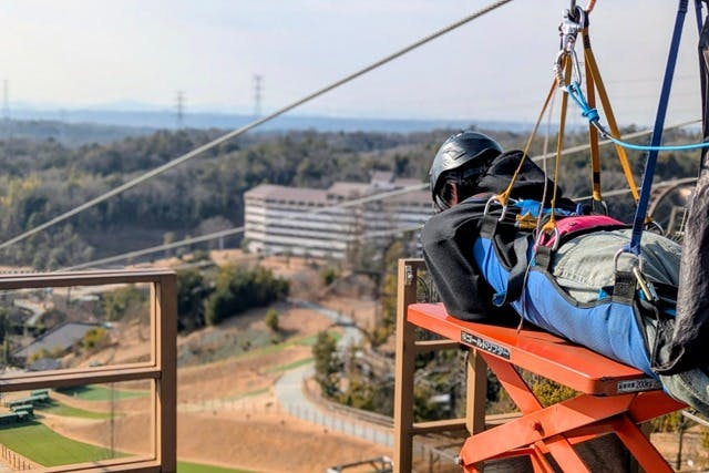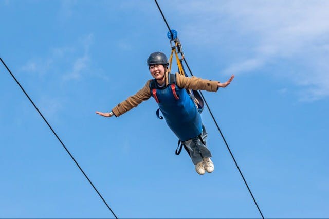 スピードは時速30kmから最大75km程度になることもあり、うつ伏せジップラインでは日本最速!風を体に受けて本当に鳥になった気分。
