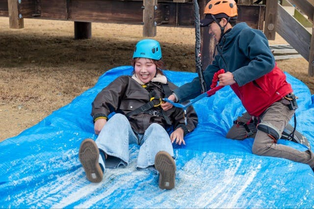 まずはハーネスやヘルメットをつけて、安全に遊ぶ方法をレクチャーしてもらいます。