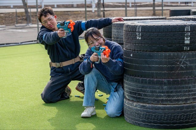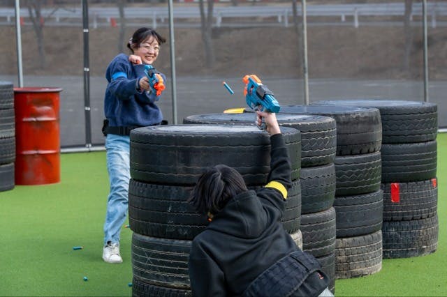 オープンしたばかりの「ブラスター・バトルフィールド」は、ブラスター(銃)とダーツ(銃弾)を使って、リアルなFPS体験ができるアクティビティです。フィールドに散らばったダーツを充填し、障害物に身を隠しながら仲間とアイコンタクトをとって敵陣へ攻め込みます。仲間と連携して相手チームを攻めるスリルは、日常では味わえない体験。