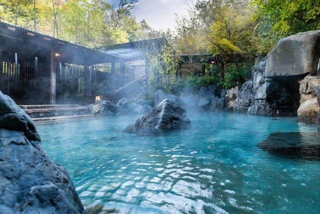 - 帰りは大自然に囲まれた天然温泉でゆっくり。