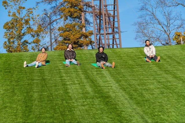 キャニオン・スライドは、人工芝の斜面を一気に滑り降りる、シンプルだけど熱中度の高いアクティビティ。専用のそりに座って斜面を滑走します。