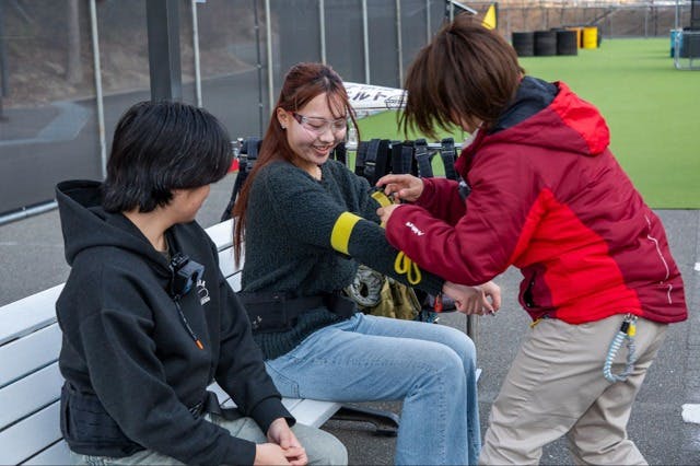 まずはチームに分かれて、ゴーグルやヘルメット、ブラスター、ベルトを装備します。チームメンバーがわかるようにカラーバンドも装着。