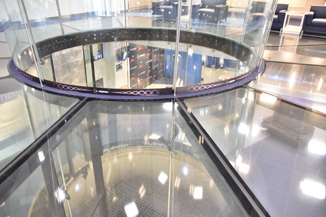 2階から見ると、ウインドトンネルの周辺はクリアな床面になっています。低い位置で浮遊する姿はもちろん、高さ20mほどまで上昇している姿も見られますよ。