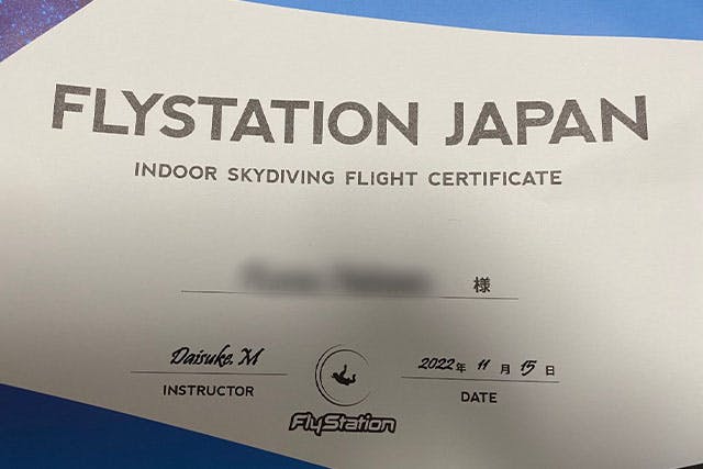 すべてのプログラムが終了すると、インドア・スカイダイビング「フライステーション」のフライト証明書が貰えます。名前や日付も入っているので、いい思い出になりそうですね。フライト証明書を片手に記念撮影して、SNSに投稿するのも楽しそうです。