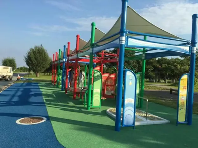 沖縄市にあるコザ運動公園アスレチック広場は、公園の斜面を巧みに活用したユニークな遊具が魅力です。沖縄の伝統文化である締め太鼓や三線をモチーフにした遊具は、遊びながら地域の文化に触れるきっかけにもなります。さらに、全身を使って楽しめる大型アスレチック遊具も充実。幼児から小学生、中学生まで、幅広い年齢の子どもたちがそれぞれのペースで思いっきり体を動かせます。広々とした空間で、子どもたちが自由に駆け回り、創造力を育むのにぴったりな場所です。休憩スペースも完備されているため、保護者の方も安心して見守れます。