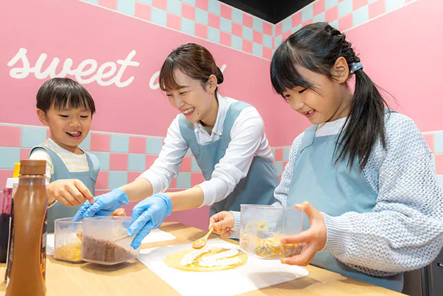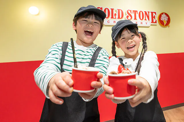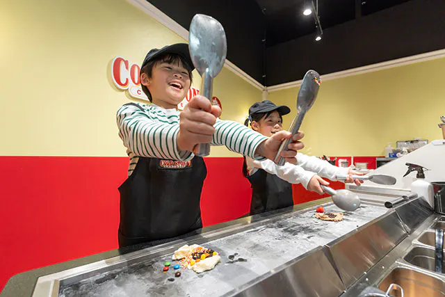マイナス9度に冷やした石板の上で、注文に合わせてアイスクリームとトッピングをミックス!歌を歌いながらハッピーなスイーツを作る、アイスクリームクルーの仕事です 。出来上がったアイスを笑顔でお客さまに届ける喜びを体験できます 。