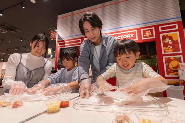 せっかくなら、料理も体験を通じて楽しみたい!そんなファミリーにイチ押しなのが「ピザ作り」です。ピザブース前にあるQRコードを読み込み、1枚1,000円でピザキットを購入。自分の席で生地をこねて伸ばし、好きなソースとトッピングを乗せたら、スタッフに焼いてもらいます。5〜10分ほどでアツアツのオリジナルピザが完成!自分で作ったピザの味は格別ですよ。