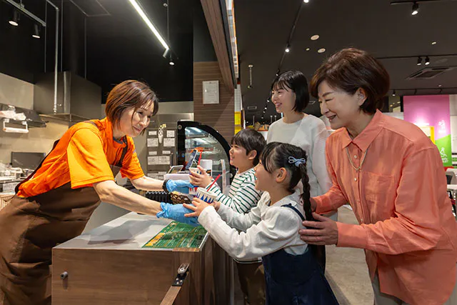 フードやドリンクの注文は座席からスマートフォンで行うことができ、用意ができたらLINEで知らせしてくれる便利なシステムを採用。注文のために列に並ぶ必要がないので、子どもの体験を見守りながらゆっくりと選ぶことができます。