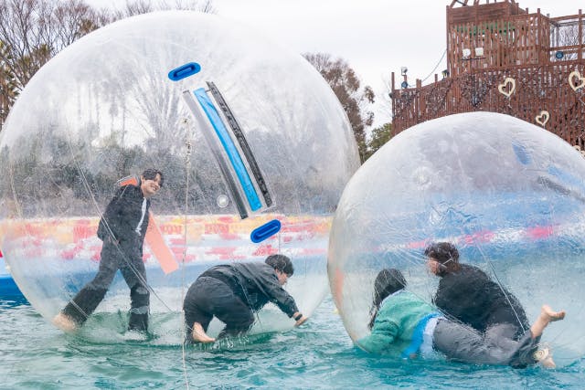 水の上を歩く、転がる、笑いあう。巨大なバルーンの不規則な動きを楽しみつつ、仲間と協力してバランスをとりながら進みましょう。ドキドキ、ワクワクが止まりません!
