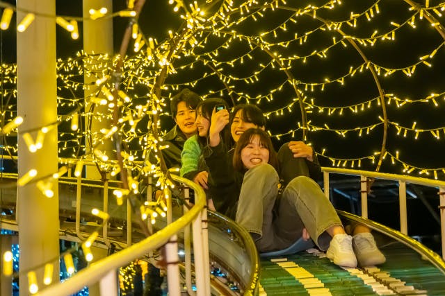 全長110mのロングイルミネーションスライダー。7色の光に彩られたトンネルを滑り降ります。「光の一部になる」ようなスピード感と絶景は、昼とはまた違った魅力が感じられます。