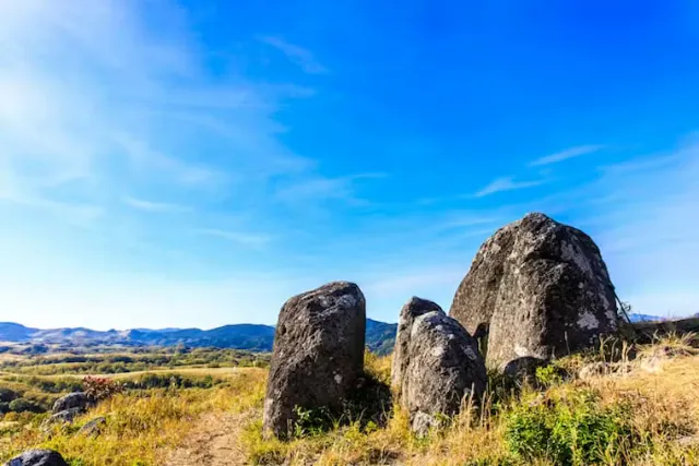熊本県阿蘇郡南小国町にある「押戸石の丘」は、巨岩群が並ぶミステリアスなスポットです。シュメール文字が刻まれた石や、太陽の動きを測る日時計石など、多数の巨石が点在しており、その配置には不思議な意味が込められているといわれています。丘の上からは阿蘇の雄大な景色も一望でき、開放感も抜群。古代のロマンを感じながら、不思議な体験ができる場所です。