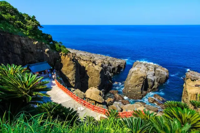 「鵜戸神宮」は、波打ち際の洞窟の中に、鮮やかな朱塗りの本殿が鎮座する珍しい神社です。太平洋の荒波が打ち寄せる岩場に位置し、その神秘的な雰囲気は訪れる人々を惹きつけます。また、安産や子育て祈願の古社としても知られており、家族の幸せを願う人々が多く訪れるのも大きな特徴。海と洞窟が織りなす独特の景観は、一見の価値がありますよ。