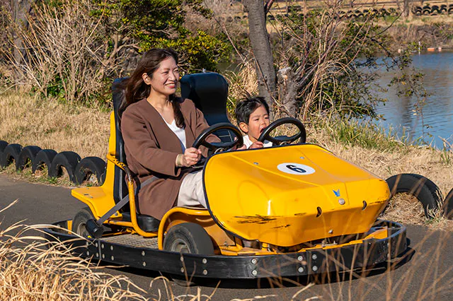 本格的なコースを風を切って駆け抜ける「GOGOカート」。身長130cm以上ないと運転はできませんが、助手席にもハンドルがついているので、息子もドライバー気分を満喫できたみたいです。