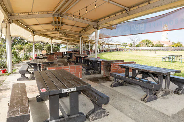 広々としたBBQ場は、屋根付きなので雨の日でも快適に使用できるのがうれしいところ。目の前が芝生の広場になっているので、開放感も抜群です。