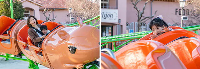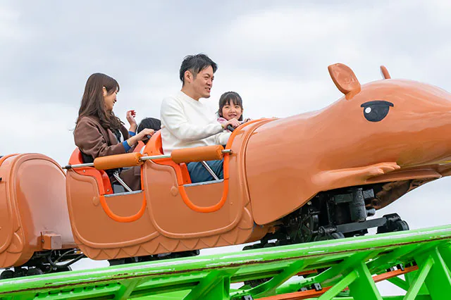 「カピバラコースター」は、かわいい見た目とは裏腹に、意外とスリリングなスピード感が味わえるのがポイント!とはいえ、子どもたちは怖がることなく、「もう1回!」とかなりリピートしてました。