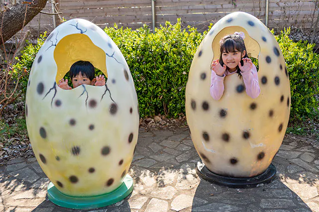 もちろん、自由に写真撮影が可能。バラエティ豊かな恐竜と思い出写真が撮れるほか、こんなかわいいフォトスポットまであるんです。