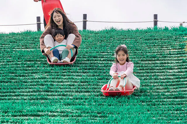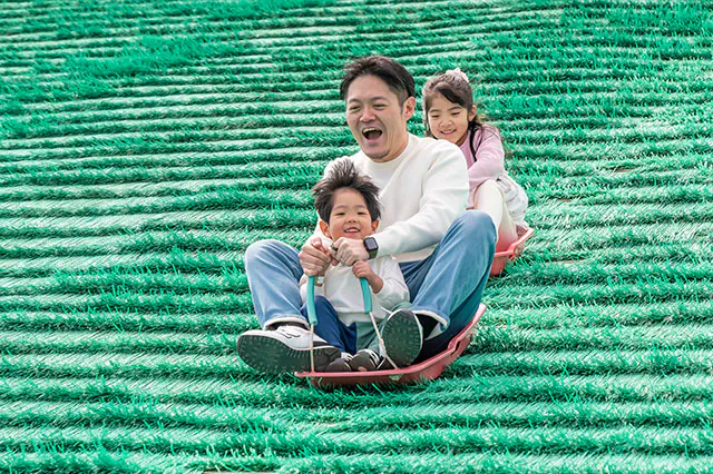 広い芝生広場に加え、無料で思いっきり体を動かせる遊具も充実。「走って、跳ねて、転がって」と、元気いっぱいな子どもたちのエネルギーを全開放できる環境です。アトラクションの合間も遊びの時間は止まりません。