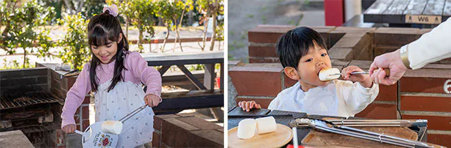 ランチの締めは、キャンプの定番「焼きマシュマロ」。BBQですっかり調理の楽しさに目覚めたのか、娘はうちわで炭火を煽りつつ、ひたすら焼くのを楽しんでいました。