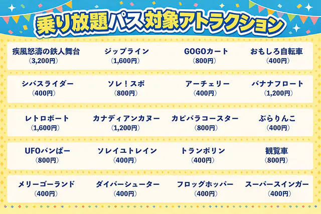 | 料金 | 入園無料(各アトラクション400円~) 一日乗り放題パス:4,000円 |