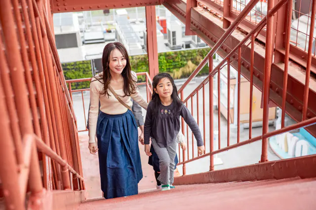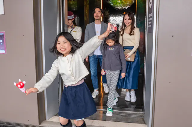 帰りは、すぐに地上まで送り届けてくれるエレベーターがおすすめです。エレベーターにスタッフさんがいるのも新鮮で、テーマパークのよう。くだり専用の外階段もあるので、どちらでいくかは家族で相談!