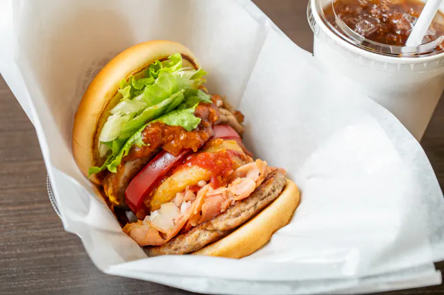 モスバーガー東京タワー店限定の「東京タワーバーガー」は、パストラミベーコンやオニオンフライなどが入ってボリューム満点!なんと15層も重なっています。