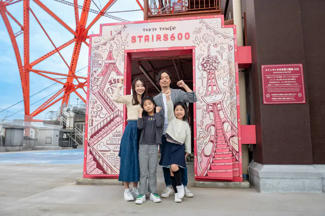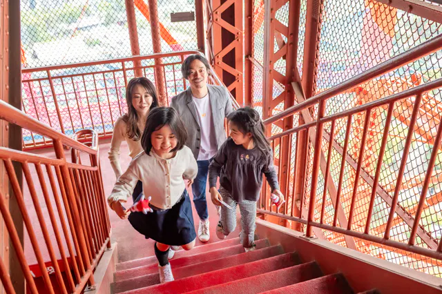 今日は、元気いっぱいの姉妹を連れて東京タワーへおでかけ。いつも乗るエレベーターをお休みして、自分たちの足で一歩ずつ空を目指すことにしました。バッグの中には、娘たちが大切にしている東京タワーのキャラクター「タワオ」のぬいぐるみも一緒。約600段の階段を昇って、家族で東京タワーのメインデッキを目指す冒険のはじまりです!