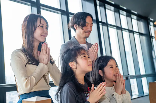 姉妹が並んで静かに手を合わせる背中を、少し後ろから見守り「家族が健康でありますように」とお願いしました。